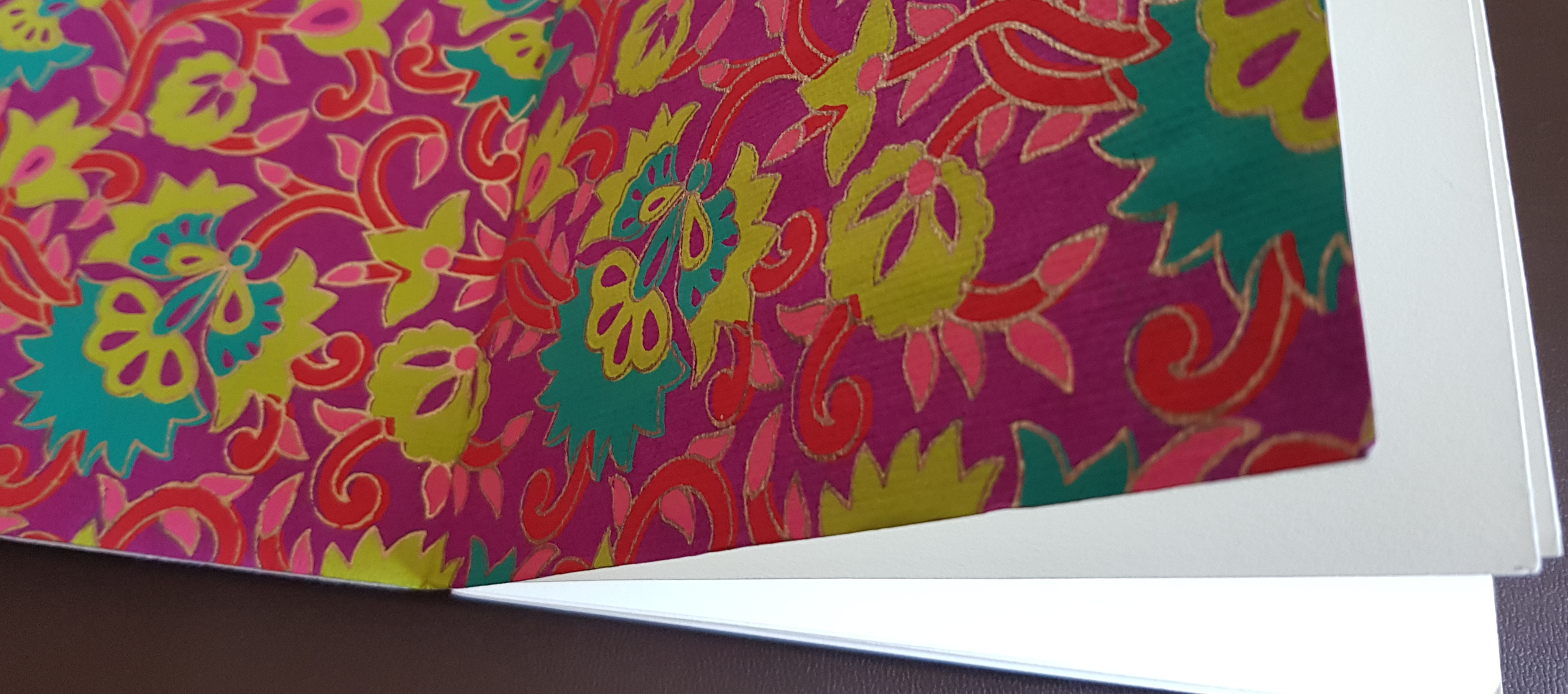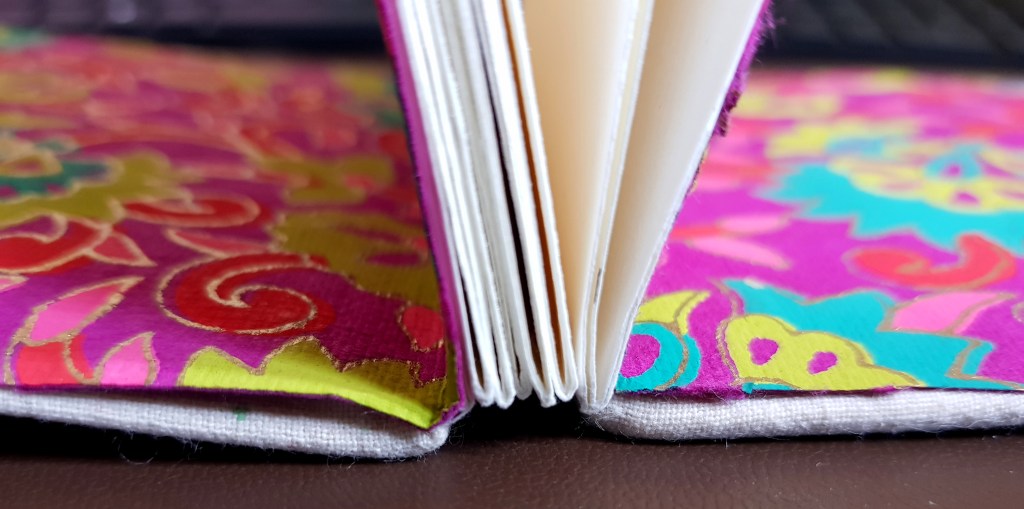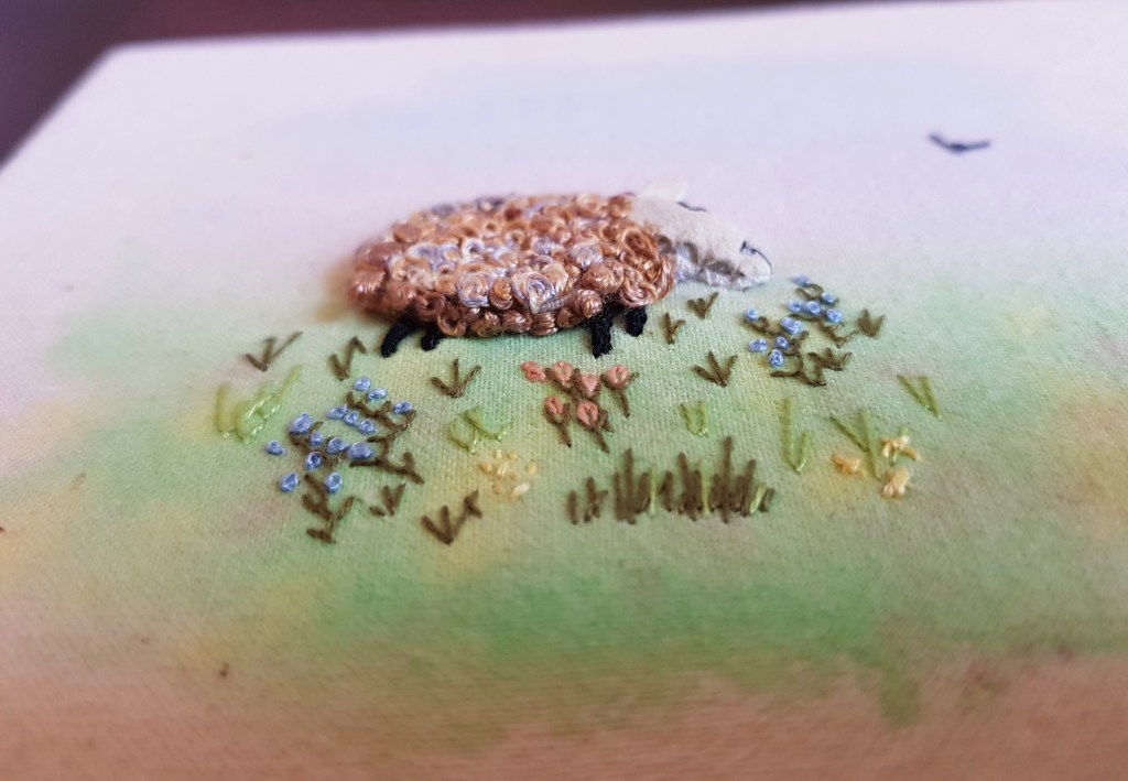 This planned series of poems was inspired by two things: a hand-made book and a favourite uncle (not that he is a thing of course). The small book is filled with hand-made blank paper pages, painted with a pale wash; these pages are hand-stitched together. The cover images are crafted in a form that is called stumpwork – a raised form of embroidery. Open the little book and a beautiful inner lining is revealed; this is purchased paper but is still hand-made and painted. My plan is to fill this book with poems or verses, and the collection will be titled – ‘Memories at the Five Bar Gate.’